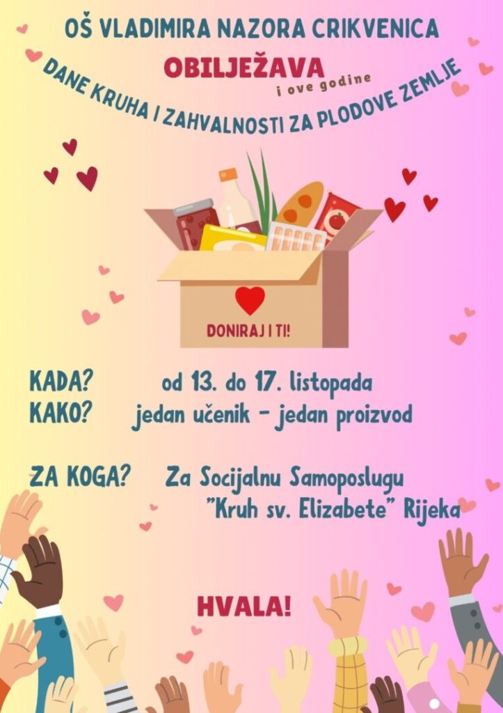 I ove se je godine naša Škola povodom Dana kruha i zahvalnosti za plodove zemlje priključila akciji “Mladi protiv gladi” kojom svaki učenik tijekom tjedna od 13. do 17. listopada donosi jedan trajniji proizvod u školu (dostavlja razrednicima) koji će se donirati Socijalnoj samoposluzi “Kruh sv. Elizabete” iz Rijeke.