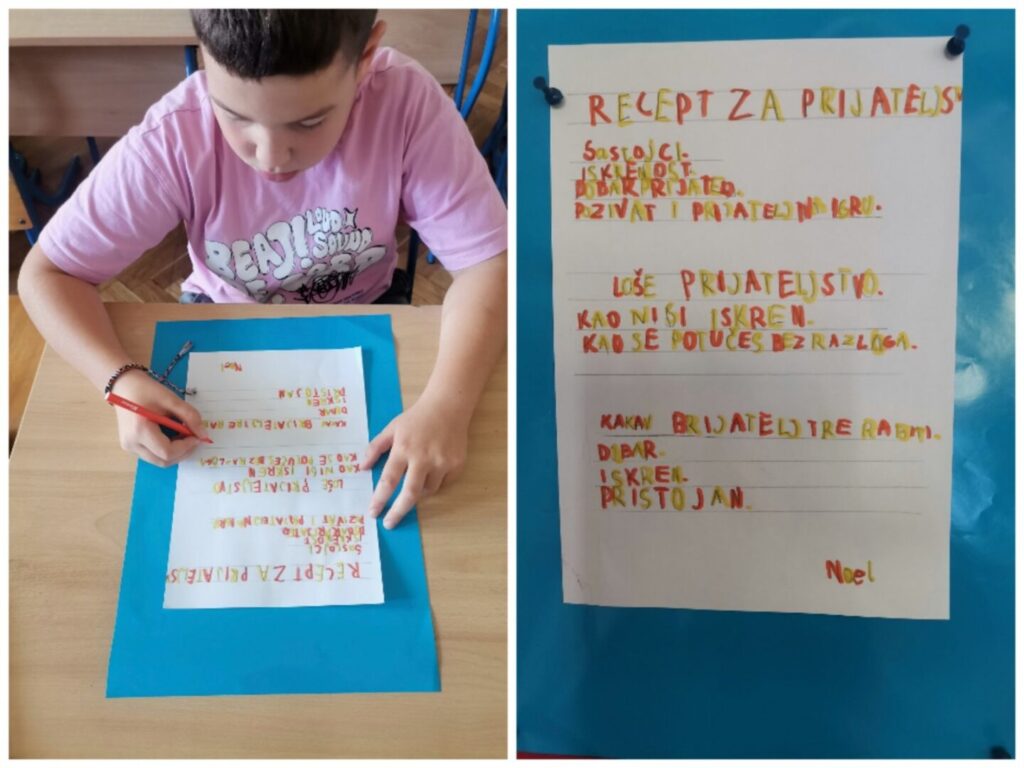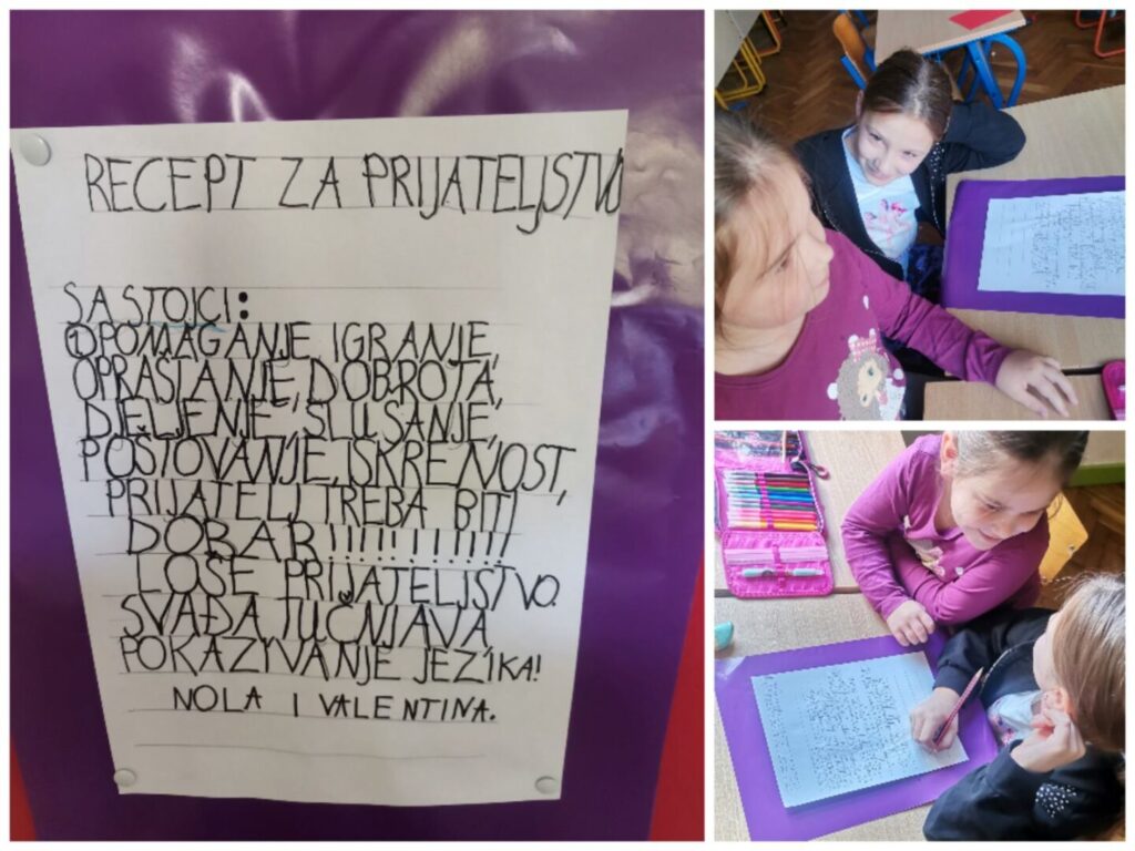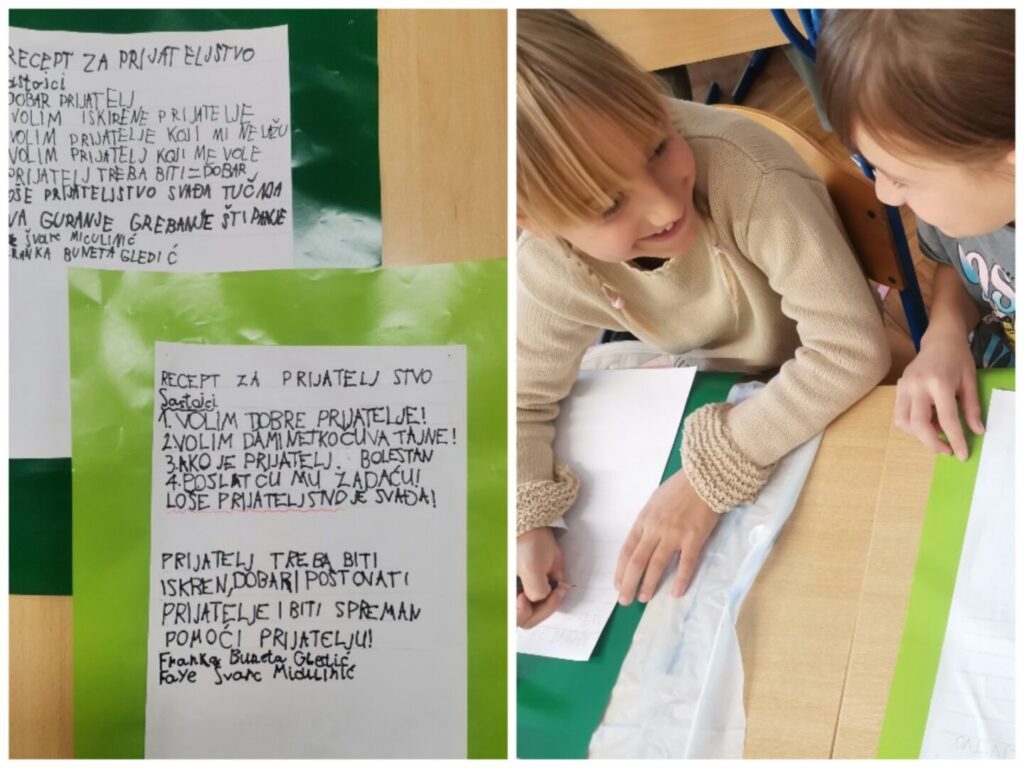 Učenici 2.a su 6. listopada obilježili Dječji tjedan radionicom “Recept za prijateljstvo”. Promišljali su o važnosti prijateljstva kroz razgovor i igru, ali su i zapisivali u paru ili pojedinačno što je važno za prijateljstvo. Kao i za svaki recept bitni su sastojci, isticanje primjera pravog prijateljstva, odrastanje u prijateljstvu. Zaključili su kroz raspravu da postoji i loše prijateljstvo, ali i kakav trebaš biti ako si pravi prijatelj.