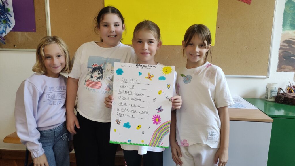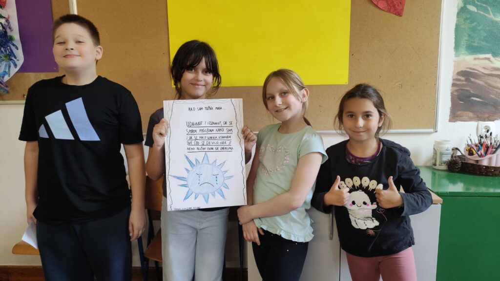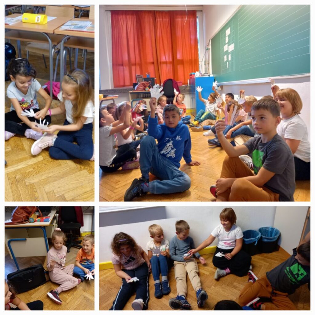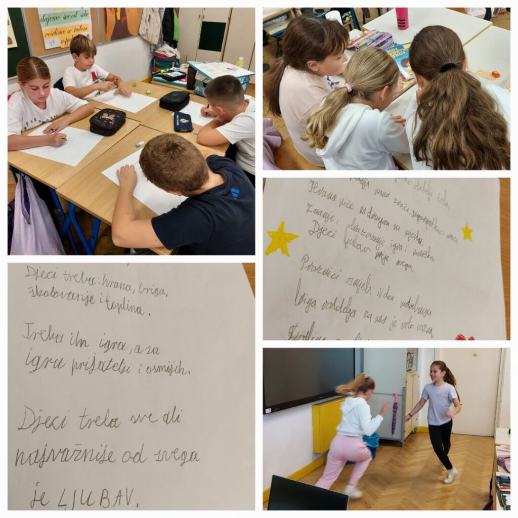 Učenici 4.a razreda obilježavanje Dječjeg tjedna započeli su uz glumačke kartice. Učenici su u parovima glumili različite situacije i osjećaje dok su ostali pokušavali pogoditi koju emociju prikazuju. Razgovarali smo o tome kako se možemo ponašati prema drugima kada osjećaju određenu emociju. Djeca su kroz igru naučila bolje prepoznati osjećaje drugih i shvatiti pojam empatije. U nastavku su, u skupinama, pisali pjesme na temu „Djeci ljubav prije svega“, izražavajući osjećaje i misli kroz stihove. Na satu TZK-a učenici su sudjelovali u igrama suradnje. Cilj aktivnosti bio je dogovor, zajednički uspjeh i međusobno pomaganje, a ne pobjeda.