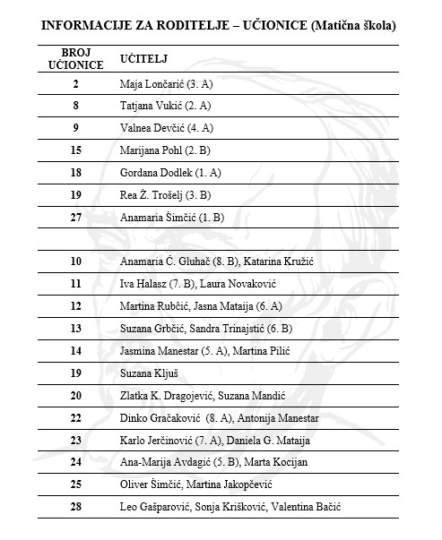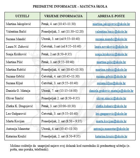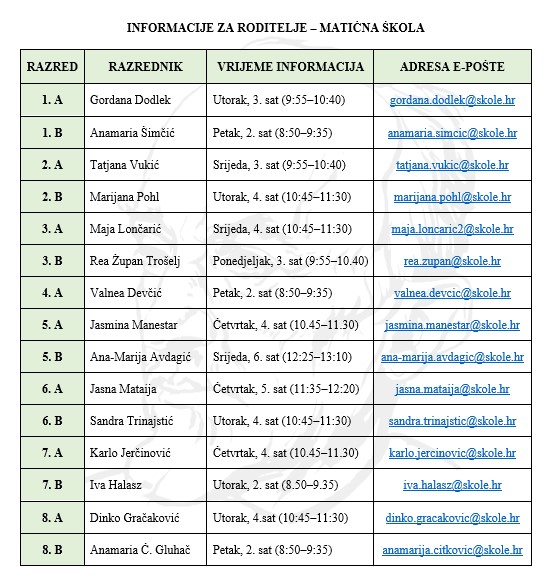 Molimo roditelje da najave svoj dolazak na individualne informacije putem e-pošte ili telefonski (051/781-091 (zbornica – 5)).